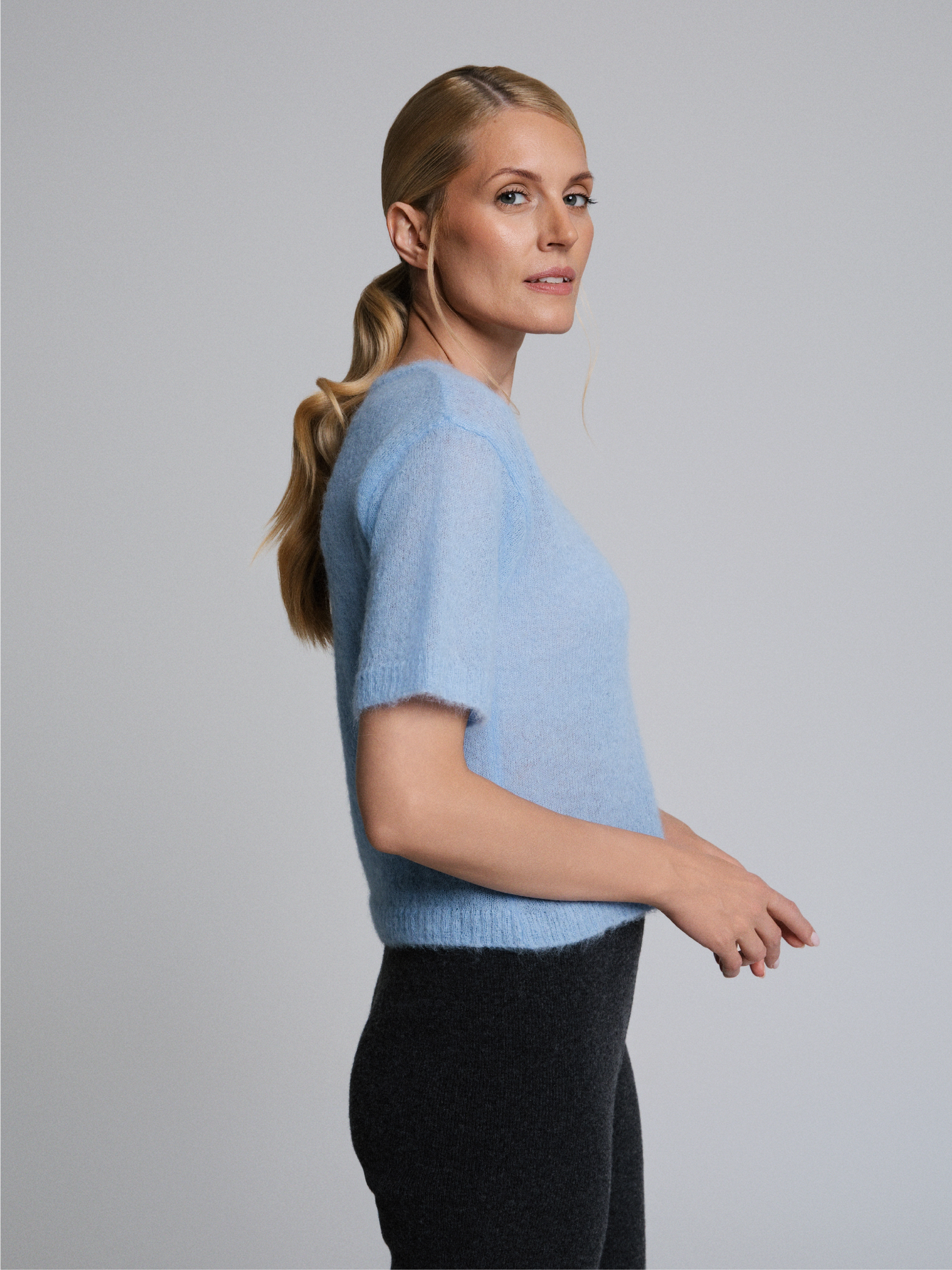 Light as air and whisper-soft to the touch, the Luna Baby Alpaca Tee is a delicate essential in your quiet luxury wardrobe. Knitted from premium baby alpaca, it wraps you in gentle warmth while remaining breathable and featherlight. Featuring a flattering crew neckline, elegant short sleeves, and a minimalist silhouette, it’s designed to be worn on bare skin or layered effortlessly under tailoring. The powdery sky blue hue evokes serenity and femininity—ideal for slow mornings or serene evenings.