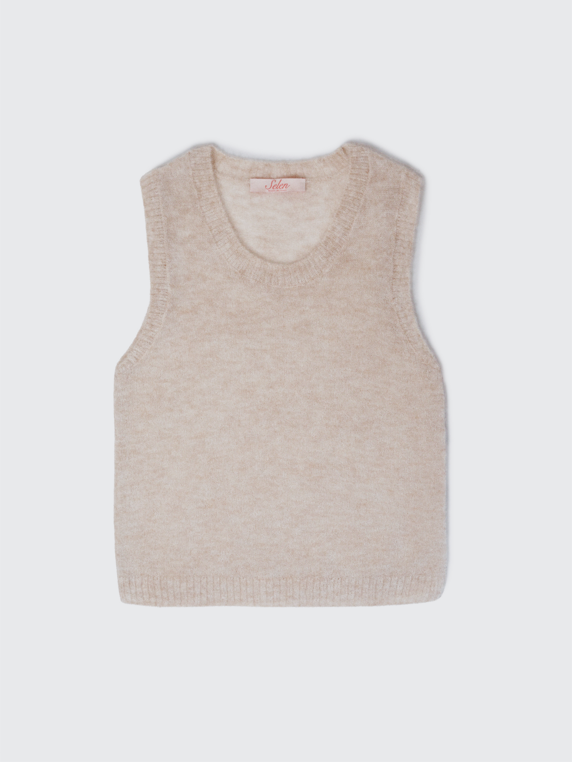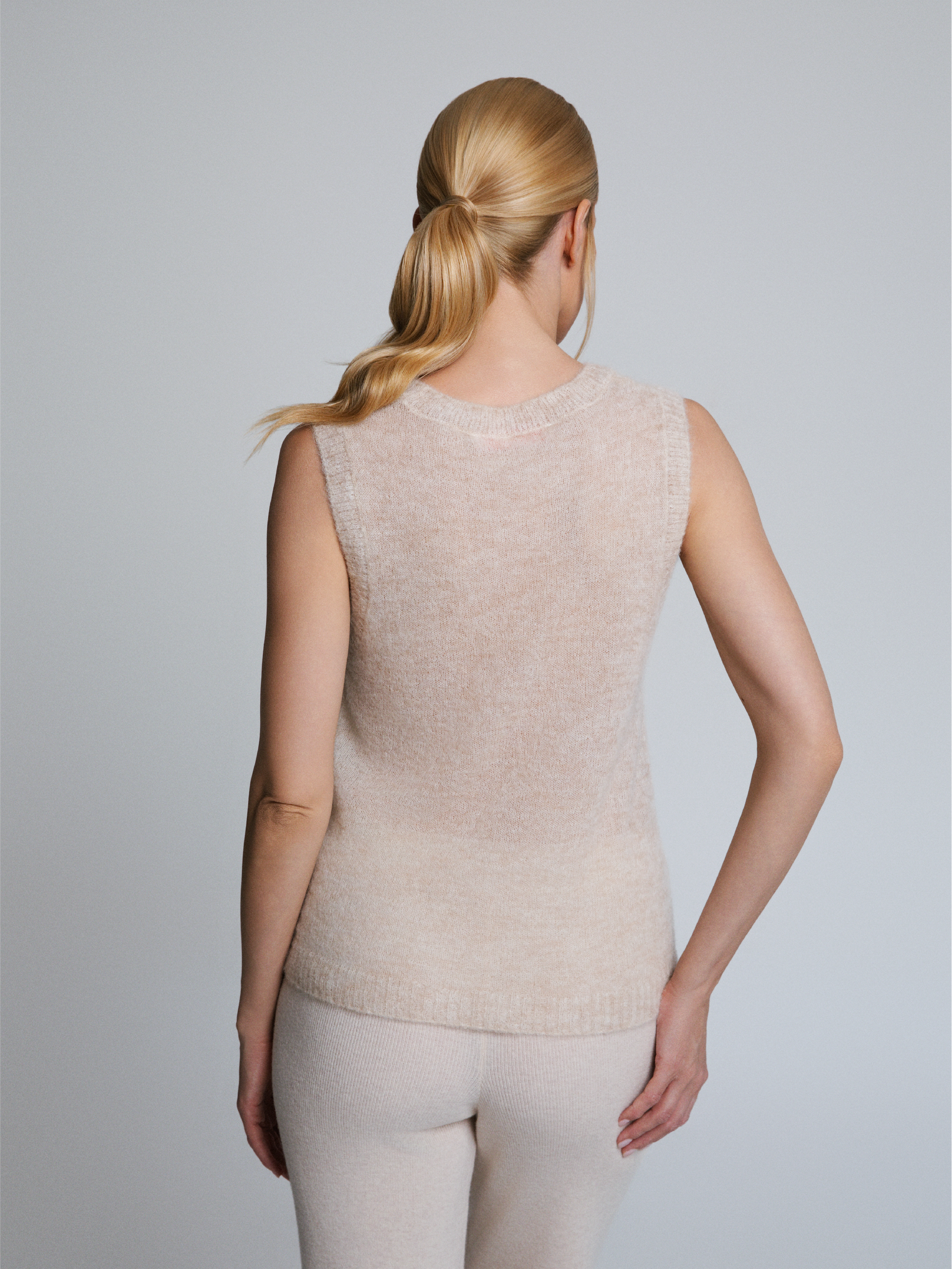 Soft like morning light, the Alba Baby Alpaca Vest is a sleeveless essential crafted in a warm ivory tone. Made in Italy from a luxurious baby alpaca blend, this style offers a barely-there feel with all the natural warmth and softness alpaca is known for. Its minimalist cut, round neckline, and subtle rib trims make it a timeless layering piece—or a standalone statement on sun-warmed days.