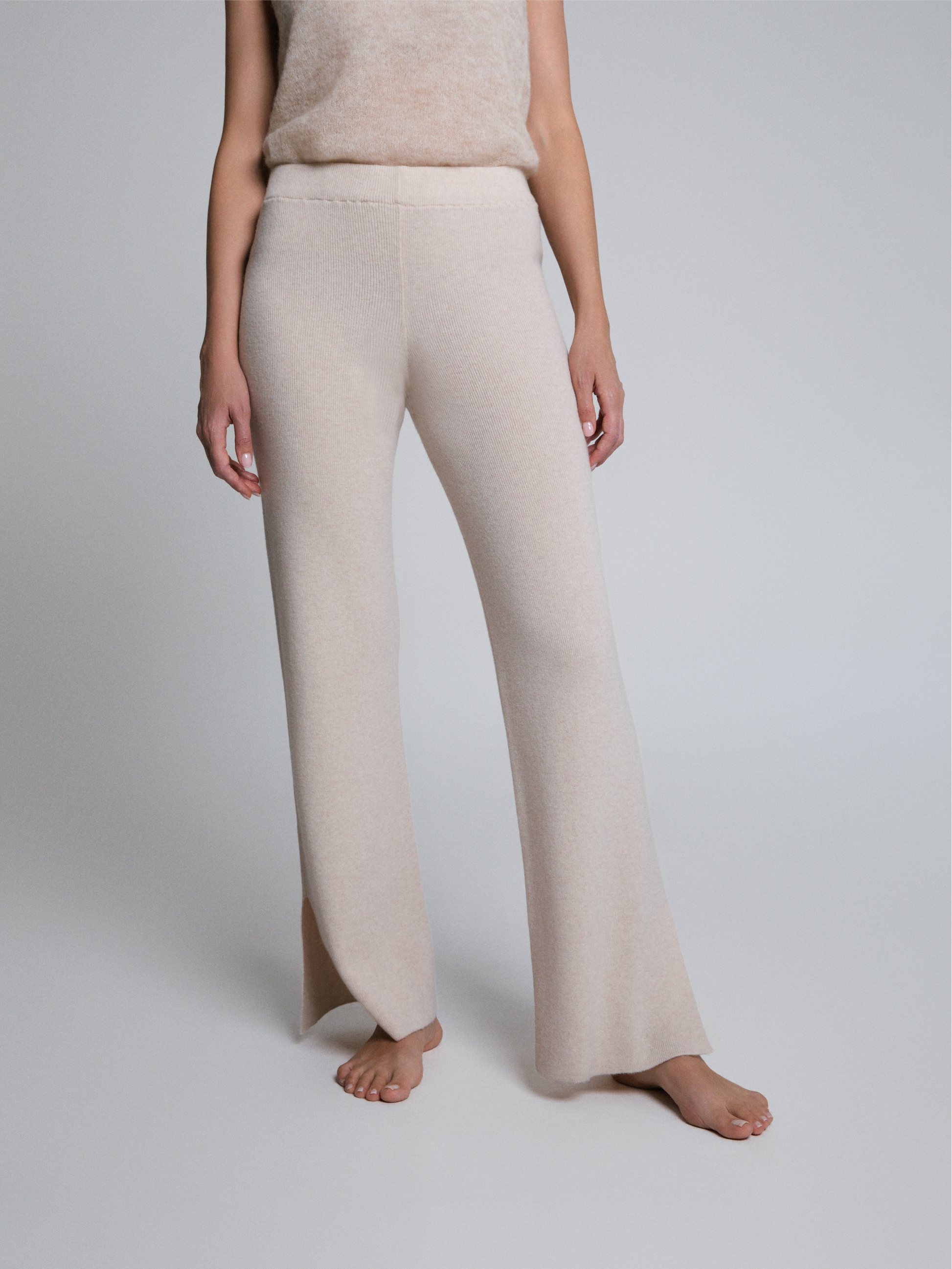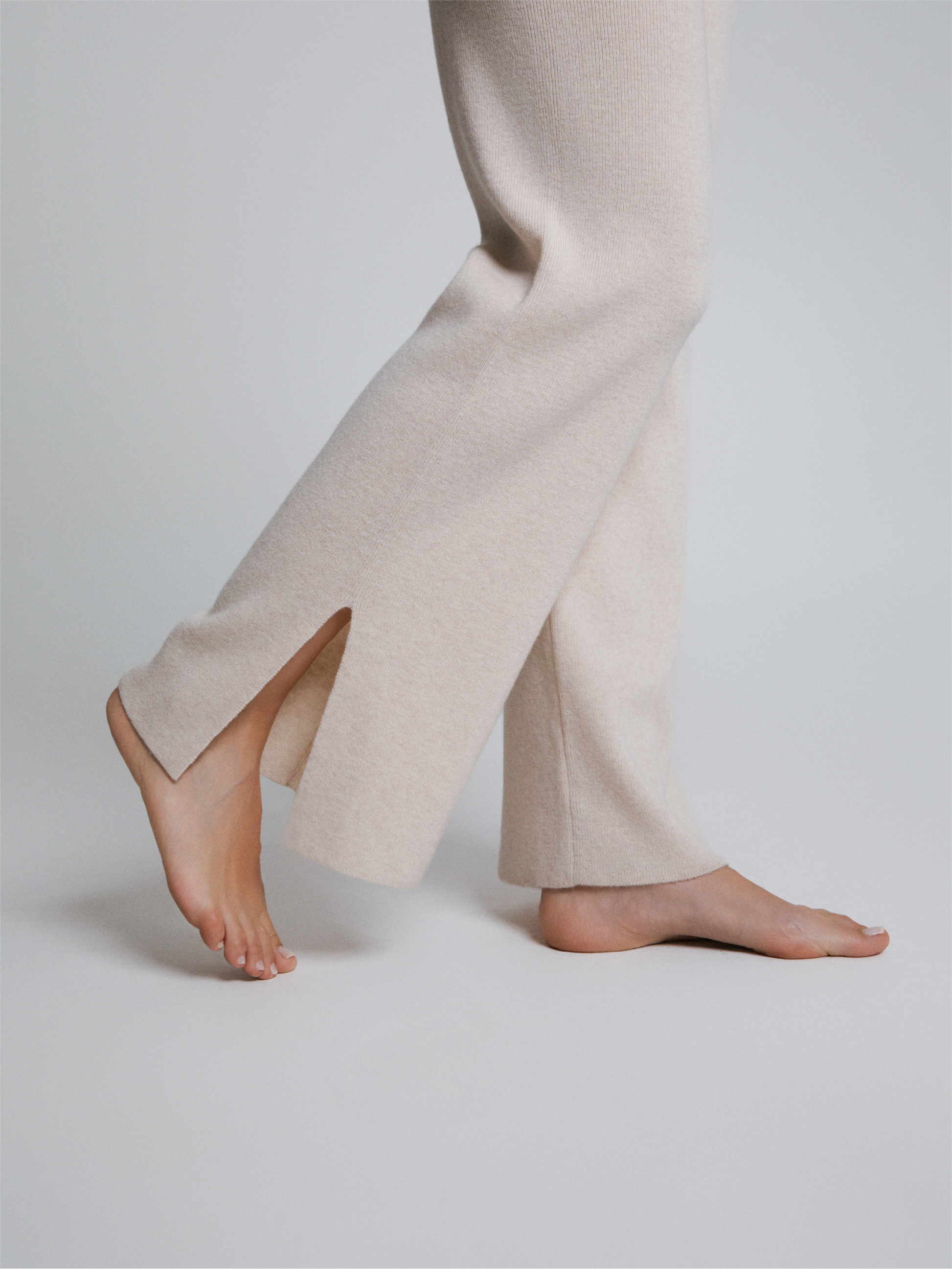 The Selen long knit pants in soft oat are tailored for a graceful, elongated line. Made from 90% extrafine wool and 10% cashmere, they fall fluidly to the ankle or floor, creating a sophisticated drape. The light neutral tone pairs seamlessly with your knitwear essentials—perfect for tall silhouettes or those who love a longer leg.